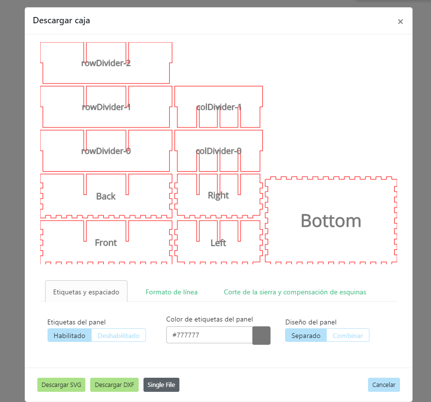 Una vez seleccionadas las características de tu caja, ya puedes descargar el archivo SVG listo para trabajar adaptando lo mínimo o nada, según las características de la cortadora de tu centro.