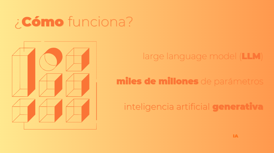 Posteriormente, analizamos cómo funcionan las IAs modernas, en especial las generativas, basadas en modelos de lenguaje grande (LLM). Estas redes neuronales avanzadas son entrenadas con grandes volúmenes de datos para generar contenido coherente y realista. Este enfoque lleva al concepto de machine learning (aprendizaje automático), que permite a las máquinas mejorar con la experiencia. Los estudiantes aprendieron sobre los tres principales tipos de aprendizaje: